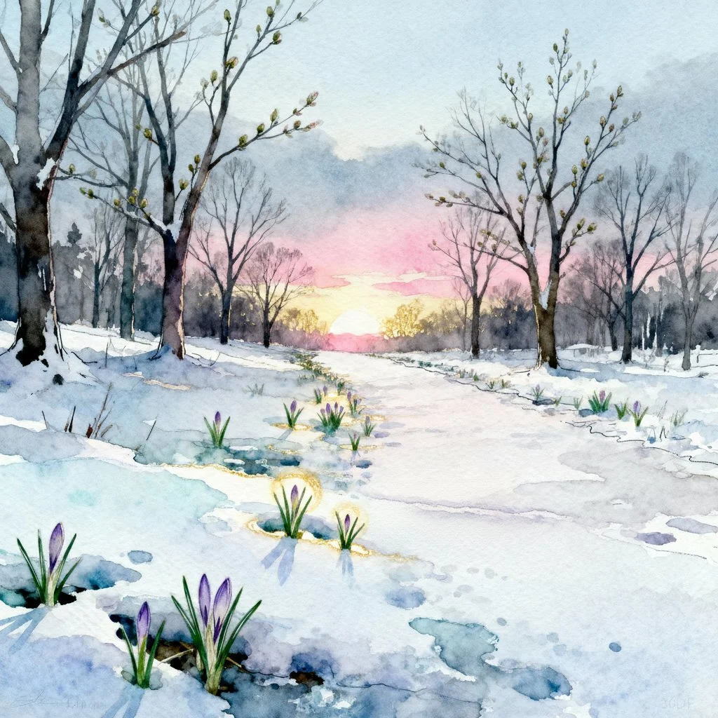 Take a slow breath and study this watercolor (above): a sunrise thawing winter, tiny crocuses pushing through snow, a quiet path toward light. Now imagine how it feels, smells, and moves. In exactly 100 words, describe what this scene awakens in you—memory, promise, a resolution, or a secret hope. Be vivid, personal, and present-tense; let the image guide your story.